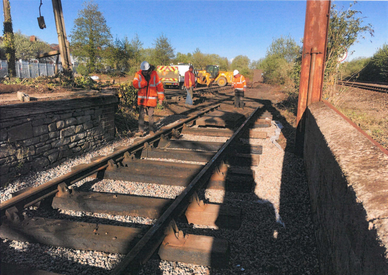The above photographs were taken on the 6th May 2021 and include views of the arrival and laying of four 60-foot panels of railway track kindly donated by Network Rail which will enable the Pacer unit to be stored alongside the platform in the steel extension of the Shed. It can be used for various purposes such as meeting rooms or classrooms and, if the unit is maintained in working order, even for short 150-metre rides within the site!